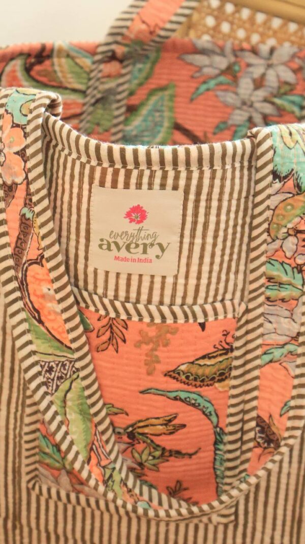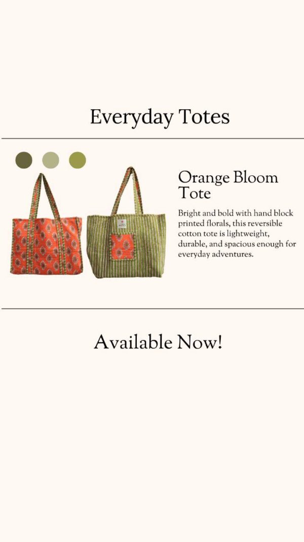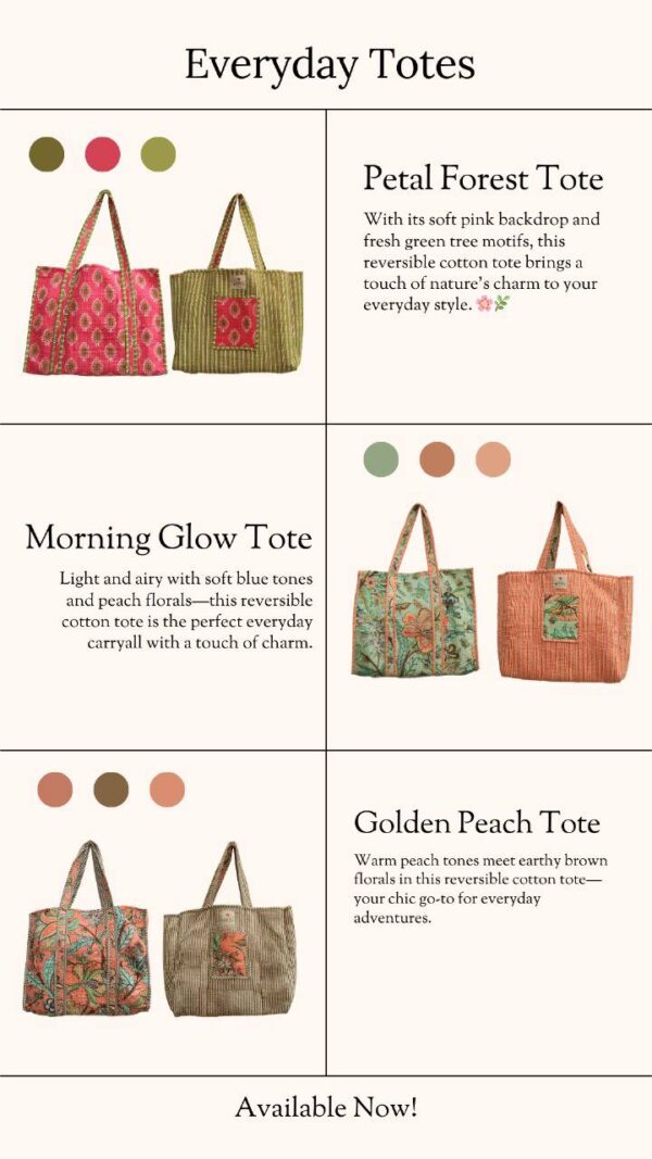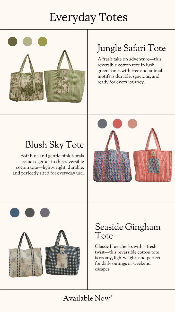 Carry beauty and function wherever life takes you. Our reversible totes are artisan-crafted in Jaipur, India, using traditional hand block printing techniques on 100% cotton.