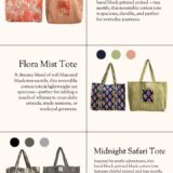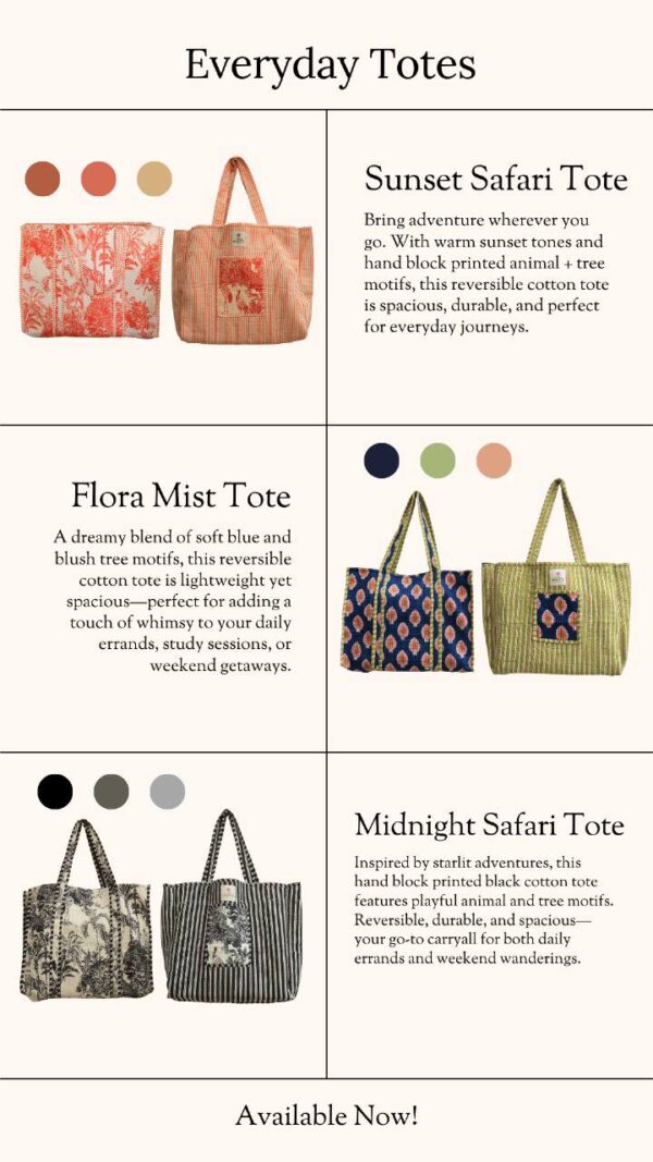 Design | Petal Forest Tote, Morning Glow Tote, Golden Peach Tote, Jungle Safari Tote, Blush Sky Tote, Seaside Gingham Tote, Sunset Safari Tote, Flora Mist Tote, Midnight Safari Tote, Orange Bloom Tote |
